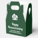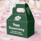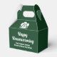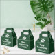 Cette boîte de faveur d'entreprise immobilière forestière est parfaitement personnalisée pour un agent immobilier qui organise une journée portes ouvertes ou offre un cadeau de pendaison de crémaillère près de la nature sauvage ou des terres boisées. La silhouette verte des arbres derrière une maison en rondins et personnalisée avec votre agent et le nom de l'entreprise de courtage immobilier pour le marketing dans les régions boisées.