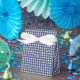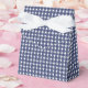 Cette boîte de faveur de cadeau est présentée dans un imprimé d'étoiles bleu marine et blanc.