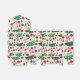 A playful Christmas pattern filled with cute cartoon elements like tiny trees, yellow stars, red ornaments, candy canes, wrapped gifts, and decorated branches. The bright red, green, and yellow tones create a joyful holiday look, perfect for party favors and seasonal celebrations.