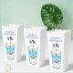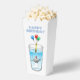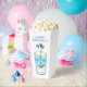 Ballotin de popcorn fête de piscine avec une jolie illustration d'une petite baleine. La baleine porte un casquette rayé rouge et blanc et a commencé la fête d'anniversaire qui a lieu dans un verre d'eau rempli.