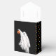 La fête créative d'Halloween favorise ou traite les boîtes avec un fantôme drôle tenant un citrouille de tour ou de traiter sur un arrière - plan à pois de polka.