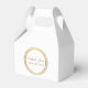 Boîte de faveur de la fête affichée en blanc avec le cercle éternel or sur l'avant avec les noms des jeunes mariés à l'intérieur du cercle. image sur l'avant seulement. Customisez cet objet ou achetez tel que conçu.