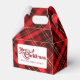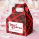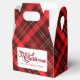 Un motif tartan rouge classique derrière votre message Joyeux Noël avec votre nom de famille personnalisé sur ce ballotin de fête de vacances. Festif, ballotin traditionnel aux lignes rouge et or.