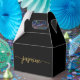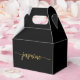 Boîte de faveur personnalisée simple et minimaliste avec monogramme en noir et or, écriture cursive au nom personnalisé. Ce design présente votre prénom dans un joli style de lettre manuscrit, une typographie de signature avec empattements (ou calligraphie) en or sur fond noir. Ces boîtes à cadeaux féminines et élégantes sont idéales pour offrir des cadeaux, des cadeaux aux invités et des friandises lors d'une fête d'anniversaire à venir, d'une baby shower, d'un anniversaire sweet 16, d'un BBQ, d'une réception de mariage, d'une soirée d'enterrement de vie de jeune fille, d'une douche de mariée, d'un anniversaire de mariage et plus encore.