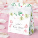 Ballotin de baby shower flamand tropical aux couleurs rose et verte. Utilisez-le dans votre baby shower pour inclure avec vos faveurs. Personnalisez le texte avec vos propres informations. Illustré et dessiné par Patricia Alvarez.