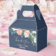 Ce romantique tourbillon bleu merci ballotin est parfait pour un mariage élégant. Le design floral présente des fleurs d'aquarelle rose pâle, pêche et blanche en cascade sur un arrière - plan bleu marine. Personnalisez le ballotin avec votre nom et la date.