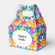 Ces boîtes de faveur de mariage faciles à customiser offrent un style moderne et rétro avec des fleurs de marguerite hippie dans le jaune vif, bleu et rose magenta. Les graphismes dessinés à la main sont conçus pour imiter l'impression de style risographe classique. Les boîtes ont un motif floral partout avec un ovale blanc sur le devant prêt à être personnalisé avec les noms de la mariée et du marié et la date mariage.