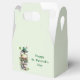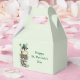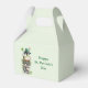 Tiny favor box with a cute St. Patrick's Day image. A green frog with big cartoon eyes sitting on a stone wall. Wearing a green top hat with a shamrock and a little friend sitting on top of his hat.