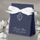 Un élégant ballotin de première communion marine et argent garçon. Sur le rabat, il a vintage crête avec une croix dedans, tous deux de faux feuille d'argent. Le message Merci est écrit dans la partie inférieure, dans un élégant faux script argent, l'occasion et la date sont écrits en casquette gris sous elle. L'arrière - plan est bleu marine.