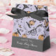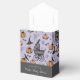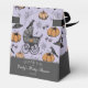Merci personnalisé Halloween/Automne ballotin Baby shower, avec des chariots de bébé dessinés à la main, corbeaux noirs, casquettes sorciers, citrouilles, toiles d'araignée et de minuscules champignons contre un élégant arrière - plan violet clair. Imprimé à l'avant et à l'arrière. Cliquez simplement sur "Personnalisez ce modèle" pour insérer votre événement et votre date.