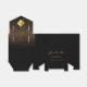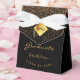 Catégorie 2025 (ou toute année). Pour une fête moderne et branchée de remise des diplômes. Un arrière - plan noir chic aux confettis dorés. Le texte : Graduate est écrit avec un grand script de style écrit à la main, des lettres d'or. Modèle pour un nom et une année. Décoré d'un casquette abstrait en faux or moderne, dessus de goût.