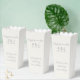 Customisez cet élégant ballotin de mariage au design simple et minimaliste. Une typographie argentée élégante et subtile, suivie d'une police sans serif simple et moderne pour les initiales monogrammées des jeunes mariés et la date du mariage, sur arrière - plan blanc perlé sophistiqué et traditionnel. Suivie par un merci personnalisable pour la célébration de notre mariage, le rendant unique et spécial pour vos invités.