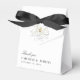Belles boîtes de faveur de mariage d'inspiration méridionale avec une magnolia blanche illustrée assise sur une typographie chic dans un aménagement moderne.