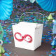 Infinity symbole of continuous stream of red pouring into glass glass glass on white background.