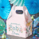 Cette boîte cadeau de baby shower fantaisiste présente un thème de jardin féerique enchanté de la forêt. Le mot "bébé" est imprimé dans une police assez turquoise à travers le centre. Il est agrémenté d'un petit jardin de champignons et de fleurs sauvages. L'arrière - plan est un motif de papier parchemin rose pâle et défraîchi qui ressemble à un vieux livre d'histoires. Des fleurs plus grandes et un petit papillon sont imprimés sur les côtés.