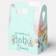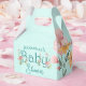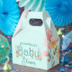 Cette boîte cadeau de baby shower fantaisiste présente un thème de jardin féerique enchanté de la forêt. Le mot "bébé" est imprimé dans une police assez turquoise à travers le centre. Il est agrémenté d'un petit jardin de champignons et de fleurs sauvages. L'arrière - plan est un motif de papier parchemin doux turquoise et défraîchi qui ressemble à un vieux livre d'histoires. Des fleurs plus grandes et un petit papillon sont imprimés sur les côtés.