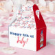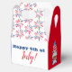 Bonjour pour le rouge, le blanc et le bleu. Ce quatrième ballotin amusant est décoré de couleurs patriotiques. Les panneaux avant et arrière ont un arrière - plan blanc avec des feux d'artifice du 4 juillet et un message qui dit "Joyeux 4 juillet". Un panneau latéral est bleu, l'autre rouge. Chaque panneau a un gnome patriotique.