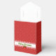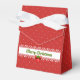 Ballotin festif avec une couleur arrière - plan principale de rouge et un motif de minuscules pois blancs. De l'autre côté de l'avant se trouve une bande d'effet dentelle blanche avec les mots Joyeux Noël en lettres vertes avec une ombre portée rouge. En dessous des lettres se trouve un arc rouge avec trois feuilles verts et des baies rouges.
