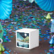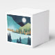 Un magnifique paysage aux textures uniques qui montre un paysage lacustre de montagne avec une lune montante et un ciel étoilé dans les tons bleu, or, vert et turquoise.