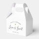 Boîtes de mariée conçues sur mesure pour les douches nuptiales avec calligraphie à la main moderne "love is sweet" et design de coeur doré.