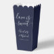 Un élégant ballotin de pop-corn de mariage avec des noms de script signature et une date spéciale dans la typographie moderne sur un arrière - plan bleu marine. Conçu par Thisisnotme©