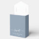 Un ballotin bleu poussiéreux pour votre mariage qui présente "L'amour est doux" dans une simple typographie blanche et un élégant script de calligraphie blanche avec des swashes, vos prénoms unis par un coeur et votre date mariage.