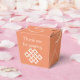 Offrez à vos invités, demoiselles d'honneur, groomsmen, ou à n'importe qui d'autre un régal spécial avec ces ballotins personnalisables avec un arrière - plan de corail avec un noeud de chance chinois blanc à l'avant et à l'arrière de la boîte. Les deux côtés présentent également un exemple de texte que vous pouvez customiser pour votre propre mariage ou événement. N'oubliez pas de consulter les autres produits de Chinese Elegance in Coral afin de créer un look vraiment coordonné pour votre événement.
