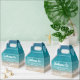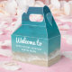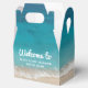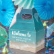 Créez une boîte cadeau de bienvenue personnalisée et imprimée en basse quantité pour votre location de vacances à la plage avec une côte de sable bleu turquoise et turquoise profond bleu océan et une typographie moderne et amusante et rétro pour accueillir les invités à votre maison de location côtière, condo, chambre, appartement.