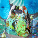 Un abstrait animé dans les tons turquoise, turquoise, orange, rouge orange, noir, blanc, or métallique et les tons verts.