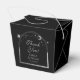 Céleste Black Silver Sun Moon Astronomy Wedding Favor Boxes présente un élégant soleil argenté, une lune et des étoiles avec un cadre argenté sur un arrière - plan noir. A l'intérieur est votre ballotin personnalisé merci informations. Conçu par Evco Studio www.zazzle.com/store/evcostudio