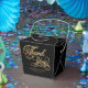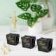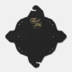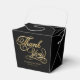 Une boîte de faveur de mariage avec un arrière - plan noir avec les mots "Merci" en fausse feuille d'or et espace pour les noms et la date mariage de la mariée et du marié.