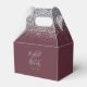 Cette élégante boîte de faveur de mariage moderne dispose d'une bordure supérieure en faux parties scintillant argent. Le texte personnalisable, répété à l'avant et au dos, combine écriture gris argenté et polices de caractères sur une grande carte sur un arrière - plan bordeaux foncé.