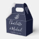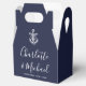 Une élégante boîte de faveur de mariage nautique avec une ancre de navire, des noms chic de script signature et une date spéciale sur un arrière - plan bleu marine. Vous pouvez personnaliser avec votre propre message de remerciement au contraire. Une façon parfaite de remercier vos invités ! Conçu par Thisisnotme©