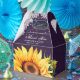 Mettez vos cadeaux de mariage ou de douche nuptiale dans ces romantiques ballotins floraux violets rustiques avec un tournesol sur un arrière - plan bordeaux orné de dentelle fleurie blanche et de lampes à cordes.