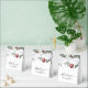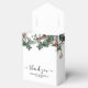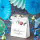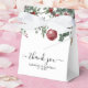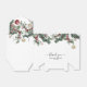 Boîtes de faveurs sur le thème de l'hiver rustique avec un fond blanc simple, des florales et feuillages aquarelles festives, des boules rouges et or de Noël, le titre 'merci', et vos noms.
