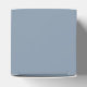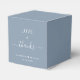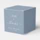 Boîte de faveur de mariage chic dusty blue qui présente "love + thanks" en typographie blanche simple et un script blanc élégant avec des fioritures, vos prénoms réunis par un cœur et votre date de mariage.