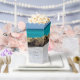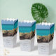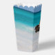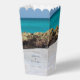 Boîte de faveur avec une belle photographie. Une plage de sable blanc, avec une mer douce. L'eau turquoise tropicale entoure un rocher déchiqueté.