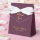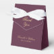 Une simple boîte de faveur de mariage avec la couleur du vin et élégante calligraphie dorée. Le Merci du message sur le rabat (et sous celui-ci) et les noms (sur le devant, dans la partie inférieure) sont écrits en calligraphie élégante et la date en chiffres plus petits sous le nom. Tout le texte est blanc et peut être modifié.