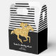 Les boîtes de faveur de pignon de thème Derby pour la fête de la mariée présentent un cheval de course en faux paillettes d'or sur des rayures noires et blanches en haut et en noir en bas avec votre message personnel. ARTICLES CORRESPONDANTS dans notre collection.