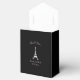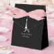 Ces élégantes boîtes de mariage à la française arborent une image blanche de la tour Eiffel sur un arrière - plan noir. Personnalisé avec l'expression "merci" et vos informations mariages en texte rose de style français et Art Déco. Un look très parisien et chic pour votre mariage.