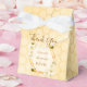 Une boîte de faveur pour une douche de mariée d'été. Fond jaune et blanc avec un motif en nid d'abeille. Avec un cadre géométrique en faux or. Décoré de fleurs tropicales jaune clair et crème, d'hibiscus et de joyeuses abeilles. Avec le texte : Merci et Mariée à l'abeille écrit avec un style de lettrage manuscrit moderne. Modèle pour le nom de la future mariée et la date de la douche. Lettres marron.