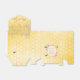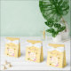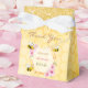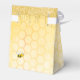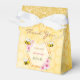 Un coffret cadeau pour un enterrement de vie de jeune fille estival. Un fond jaune avec un motif en nid d'abeille. Avec un cadre géométrique en faux or et des gouttes de paillettes en faux or. Décoré de fleurs tropicales roses, d'hibiscus et de joyeuses abeilles. Avec le texte : Merci et Mariée à l'honneur écrit avec une police de caractères manuscrite moderne. Modèle pour le nom de la future mariée et la date de l'événement. Lettres roses, vertes et marron.