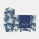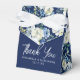 Gras bleu marine et blanc peony motif floral ballotin pour un mariage d'hiver moderne. Un élégant jet botanique de feuilles verts se déploie entouré de fleurs d'aquarelle bleu clair et d'ivoire. Le script manuscrit moderne lit le Merci au-dessus des noms du couple mariage et de la date de l'événement.