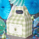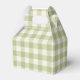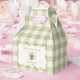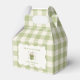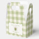 This baby shower favor box features a sage green and white gingham pattern with a watercolor matcha latte illustration in a mason jar. Design includes a soft green satin bow tied around the jar and tiny scattered hearts in muted green tones. Shows the playful text "Baby, We Love You So Matcha! Estelle's Baby Shower" in matching green lettering. Perfect for filling with candies, mini soaps, or small gifts for guests. Coordinates with the full matching collection to add a sweet finishing touch to your favor table.