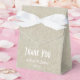 Un arrière - plan de lin naturel crème fait une belle boîte de faveur de mariage avec un arc blanc et les mots Merci en blanc, prêt à customiser avec vos propres noms et date.