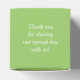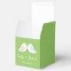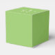 Cette boîte de faveur de mariage comporte une paire d'inséparables mignons qui se font face. Le haut de l'encadré contient du texte personnalisable pour vous permettre d'ajouter votre message de remerciement personnel ou de partir comme il est écrit : "Merci pour partager notre journée spéciale avec nous." L'avant de la boîte, sous les inséparables, est un texte personnalisable pour les noms de la mariée et du marié et leur date de mariage. La couleur arrière - plan est vert citron.