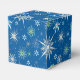 The design displays a festive and busy repeating pattern. It features a rich, solid blue background covered with numerous snowflakes of various sizes and designs. The most prominent snowflakes are large and ornate, colored in shades of white and light gray with star-like points, some of which are slightly tinged with subtle hints of green and blue. Interspersed among the larger designs are smaller, simpler snowflakes and tiny, stylized white and red flower shapes, adding to the overall dense and celebratory feel of the winter holiday motif.