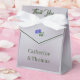 Misty Mauve et Green, un modèle catholique, présente un bel arrière - plan méchant-mauve aux noms de la mariée et du marié dans un vert profond. Les mots "Merci" sont affichés sur le rabat ci-dessus. Deux beaux roses sont exposés ensemble sous le libellé sur le rabat. Une bordure verte profonde apporte une touche élégante. Conçu pour coordonner avec la suite catholique Misty Mauve et Green Mariage Suite.