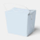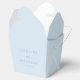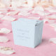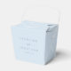 This wedding favor box features a soft dusty blue background with the couple's names stacked in wide-spaced caps with "and" in script between them, and the wedding date below in small caps. Clean, modern, and elegant.