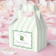 Stylish St Patrick's Day bridal shower or wedding favor boxes with a background of pale green and white stripes with a modern hand-drawn wavy border, personalized text and of course a four leaf clover (shamrock). All colors of all elements (except the shamrock) can be changed by you from inside the design tool.